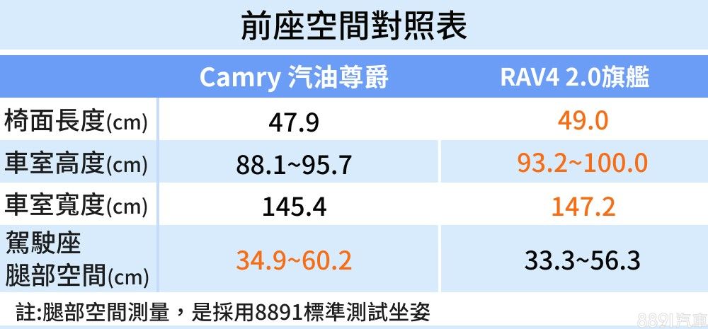 由於前排座椅可前後滑移之幅度較大,Camry為前排乘客提供較佳的腿部延展空間。不過車身偏方正的RAV4,則在車室空間展現優勢,不論高度或寬度數據皆較Camry來得充裕。