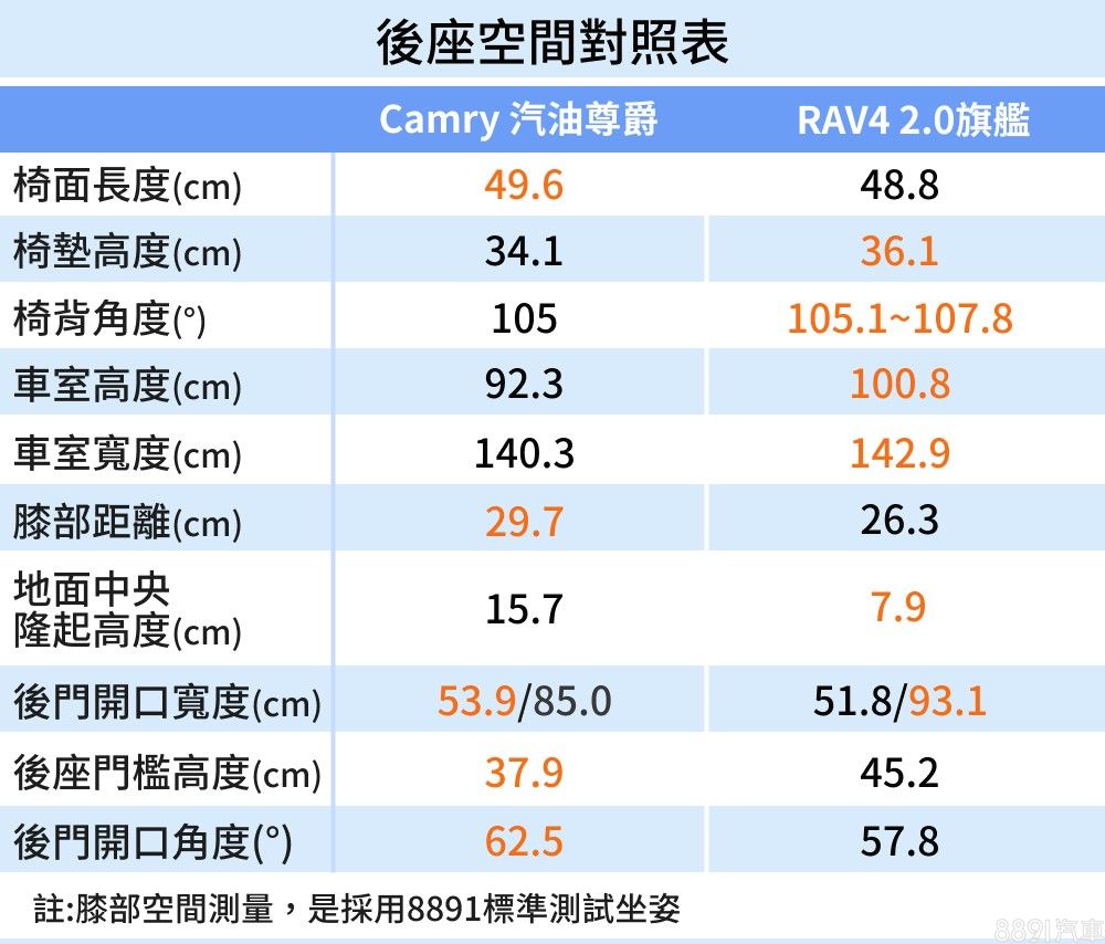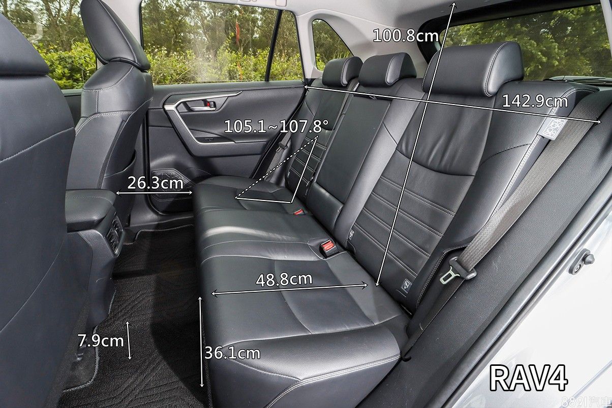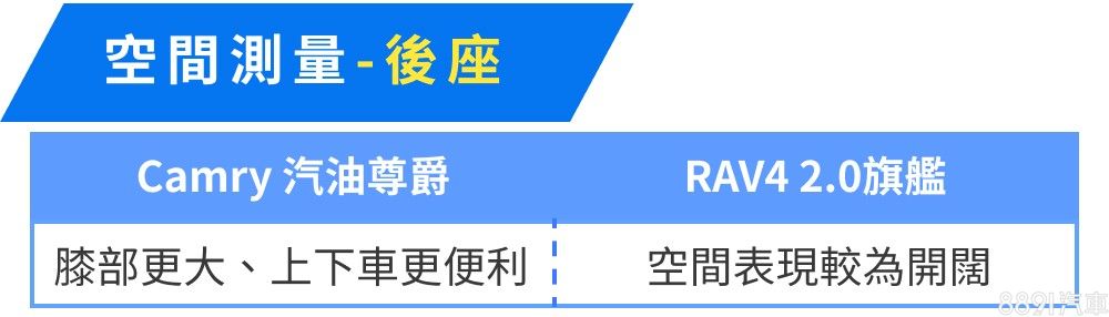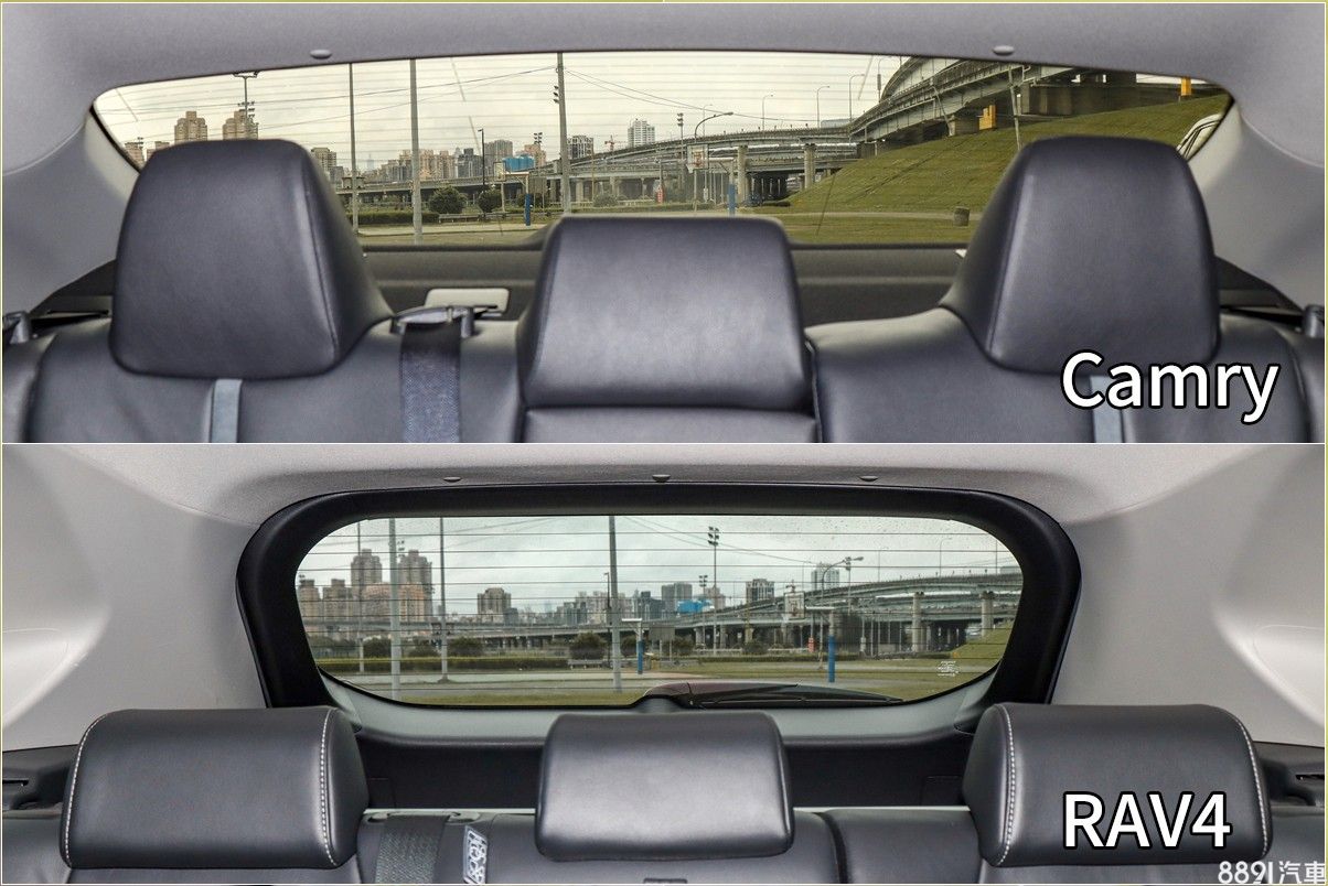 由於車室高度較充裕,RAV4後座有著較為開闊的空間感,不過為了讓後排傾倒後能盡可能平整,後座椅背的剪裁趨於平板,整體後座舒適性仍以Camry較為出色。