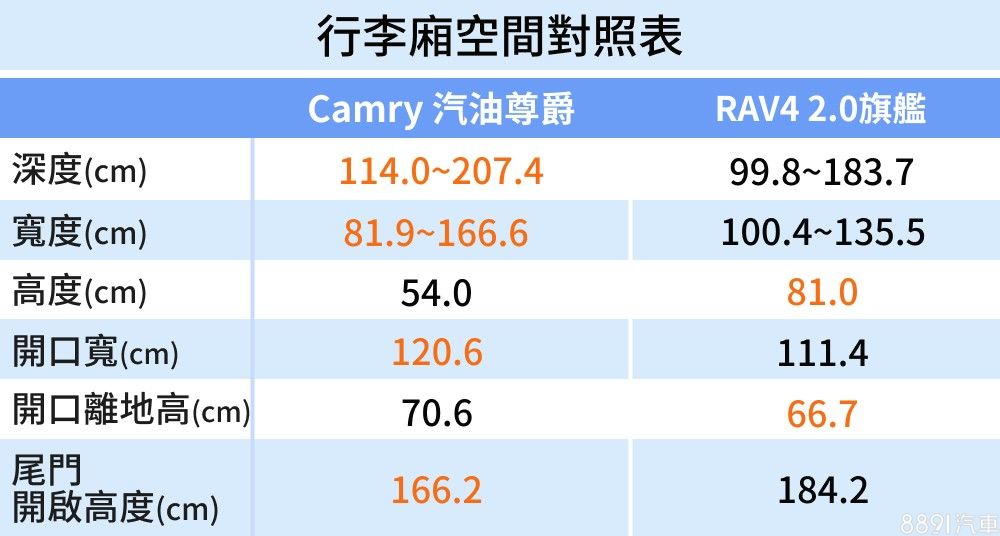 Camry具備較寬闊的行李廂開口,但較高的尾廂門檻,如需運載重物,裝卸時便會較為吃力些。RAV4則有著門檻較低且開口方正的優勢,感應式啟閉電動尾門更增添其便利性,不過需本次評比的2.0旗艦以上車型才入列標配。