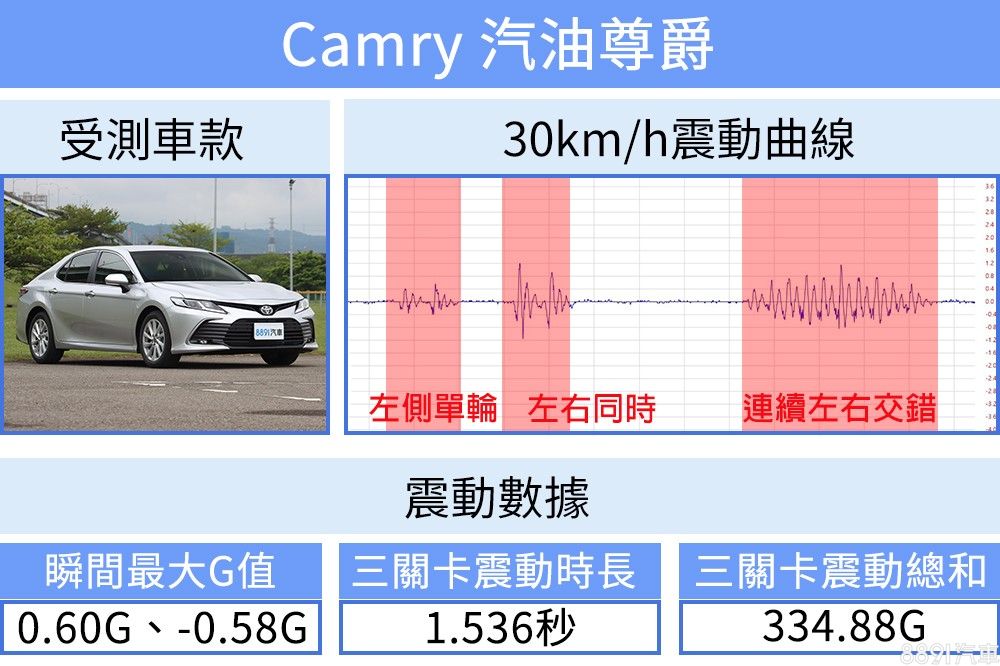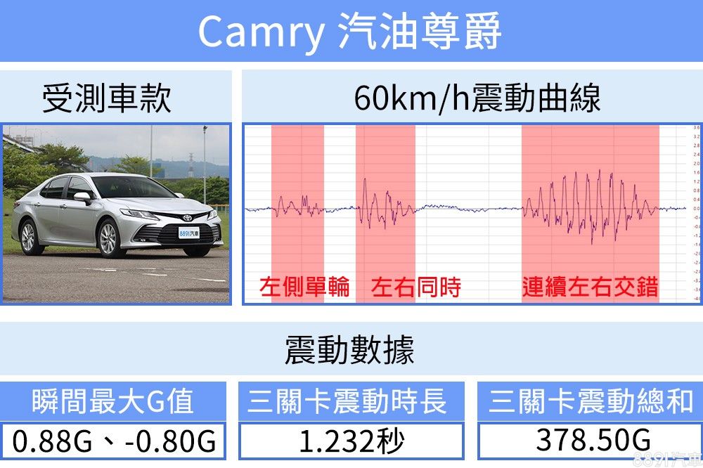 以更快的車速進行測試,當然不意外也放大衝擊感,不過不僅回穩快,最大G值僅來到0.8G左右,震動總和不過378.50G,波型也未見紊亂,皆顯示Camry出色的濾震表現及平穩的乘坐感。