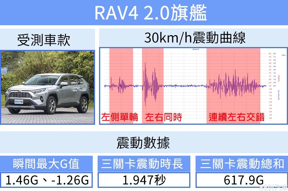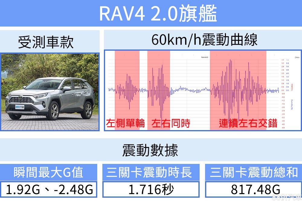 同樣加速到60km/h進行測試,更凸顯出RAV4抑震能力的不足,面對不平路面,衝擊感也較為強烈,最大震幅甚至達2.48G,整趟測試震動總和更高達817.48G。