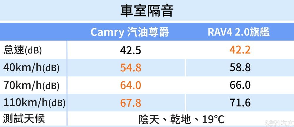 對比於RAV4,Camry展現出色的隔音表現!兩車在怠速狀態下差異不大,然而一旦上路行駛後,Camry的座艙寧靜度皆完勝對手,而RAV4不僅滾動胎噪較大,70km/h以上的高速路段,車外的風切聲更是不絕於耳,也影響了乘坐體驗。