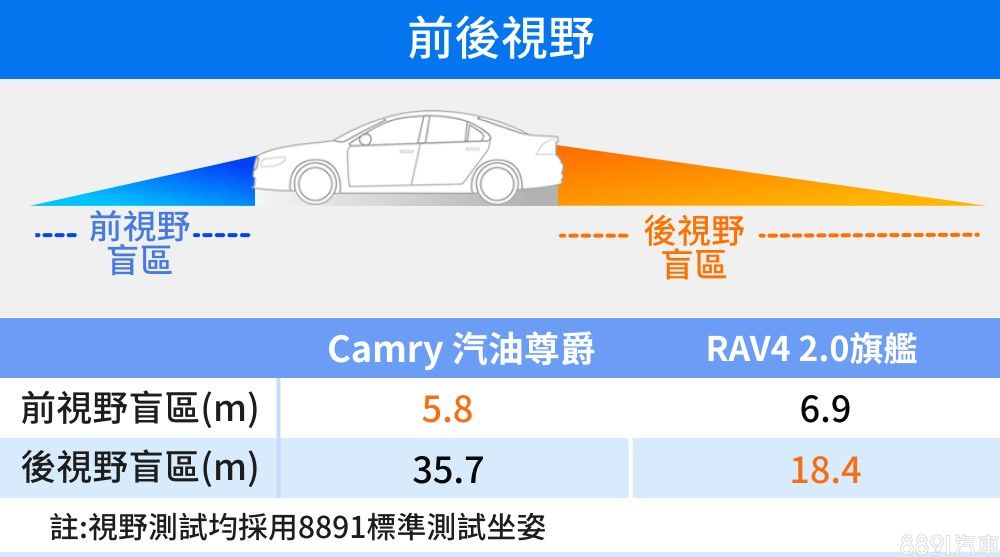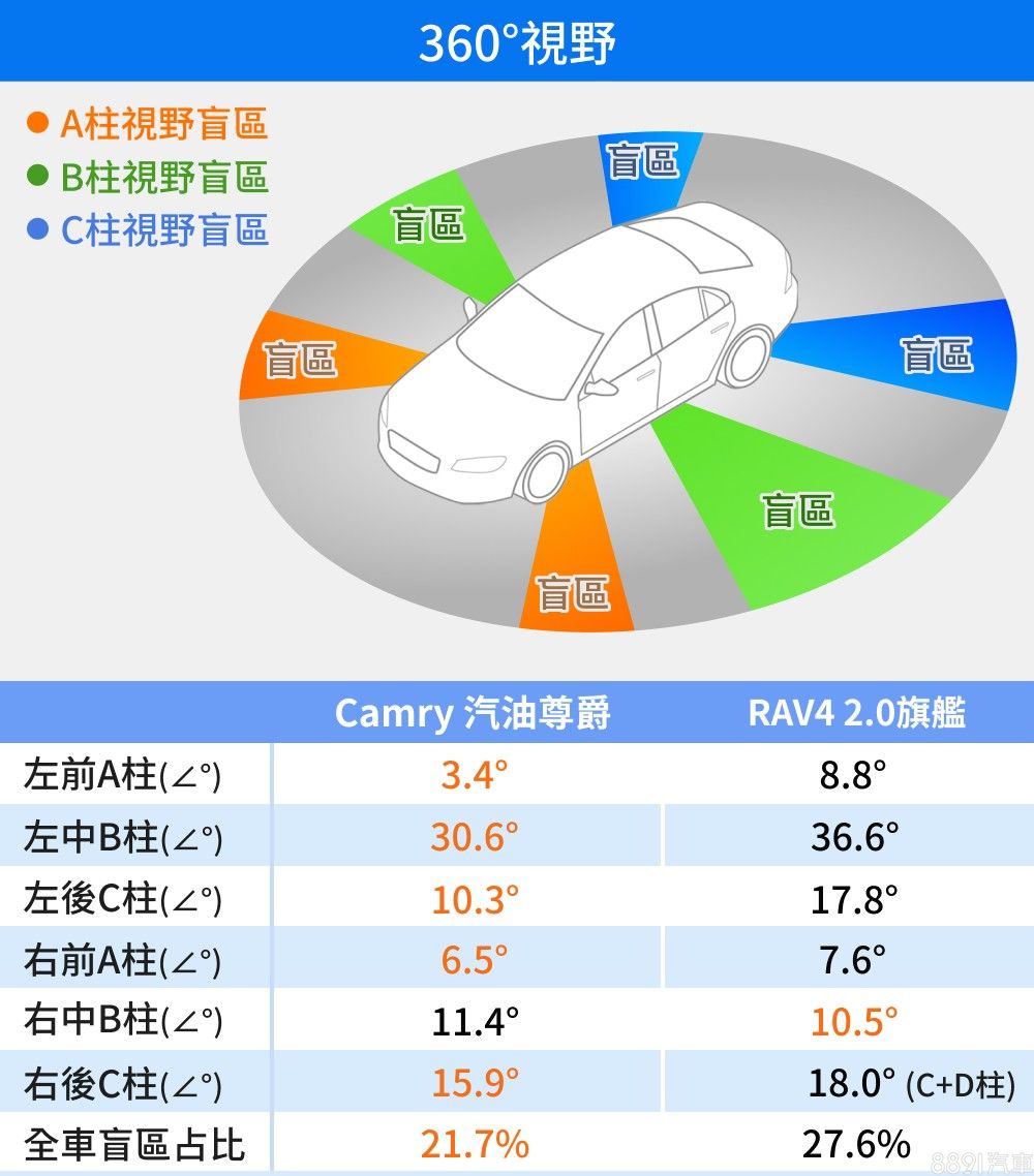 Camry環車視野優於RAV4!RAV4由於各車柱大多較寬,且內飾板顯得厚實,而後方視野又因C柱連帶D柱增加了遮蔽範圍,加上左側因靠近駕駛座放大遮蔽效果,環車視野除了右側B柱以些微差距勝出,皆較Camry明顯遜色,總遮蔽率百分比也有明顯差距。