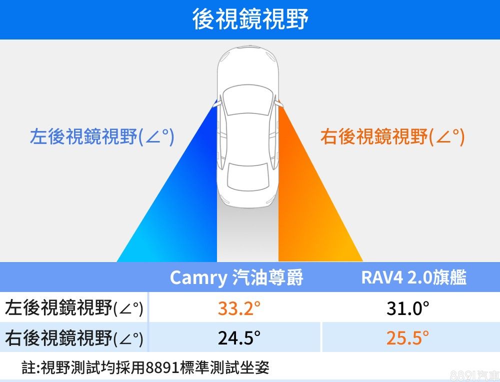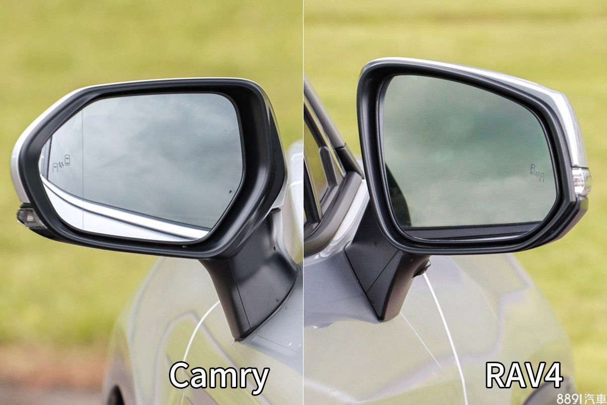 Camry後視鏡外緣具廣角效果,增添外側視野的可視範圍,而兩車右側後視鏡視野表現相當,不過實際測量數據以RAV4小幅勝出。