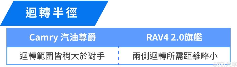 雖說Camry軸距2825mm較RAV4多出135mm,但兩側迴轉半徑並未比RAV4遜色太多,實測結果,RAV4左右迴轉所需的距離皆較Camry略小一些。