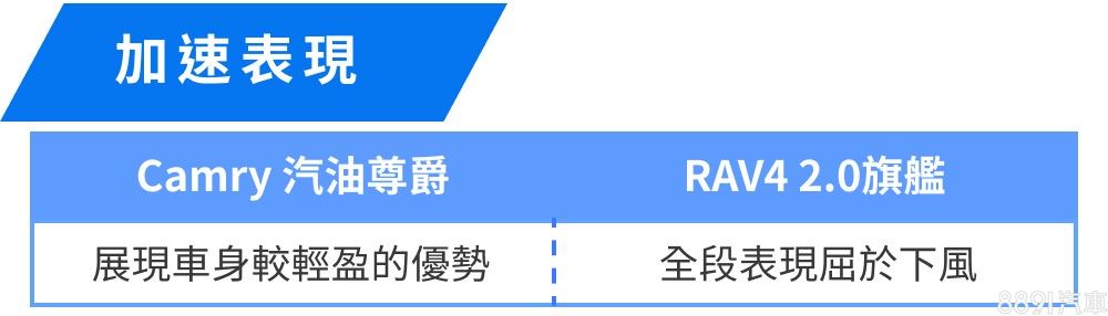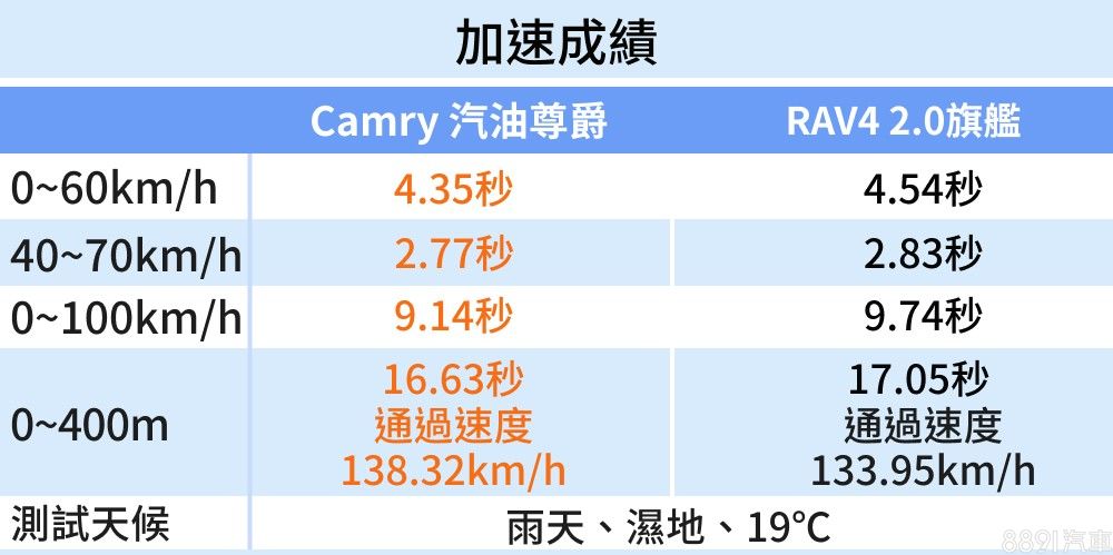 最後結果,Camry 汽油尊爵使用手排模式測得最佳成績,由頭至尾都將RAV4 2.0旗艦甩在後頭,除了上述的車重、換檔反應的差異,Camry 汽油尊爵的高速推力也更飽滿一些,也讓數據有一定程度的差距。
