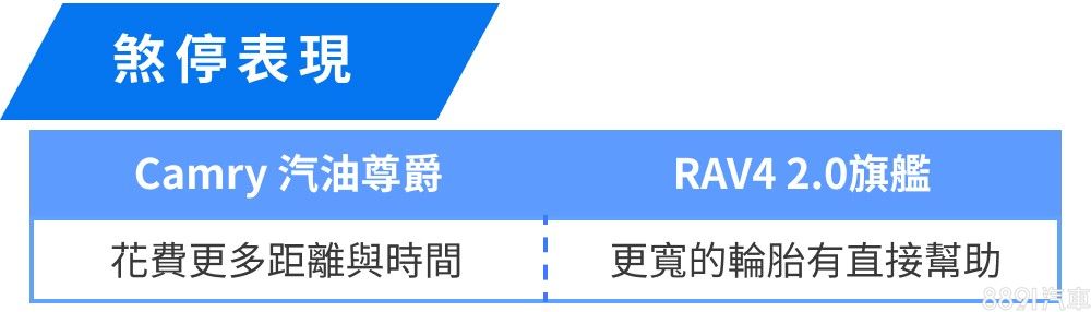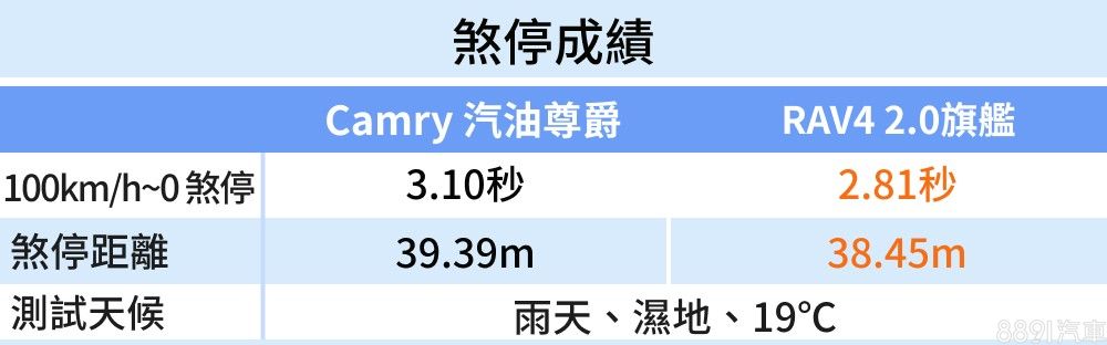 兩車煞車維持Toyota線性好掌握的特性,容易拿捏力道,制動的「腳感」清晰,符合一般乘用車能快速習慣的設定。到了100km/h煞至靜止的實測項目,濕地路況下,反而是車重較高的RAV4 2.0旗艦勝出,使用距離和Camry 汽油尊爵縮減約1m左右,能想到的原因之一,應該也和胎寬有關係,彼此單輪有10mm的差別。