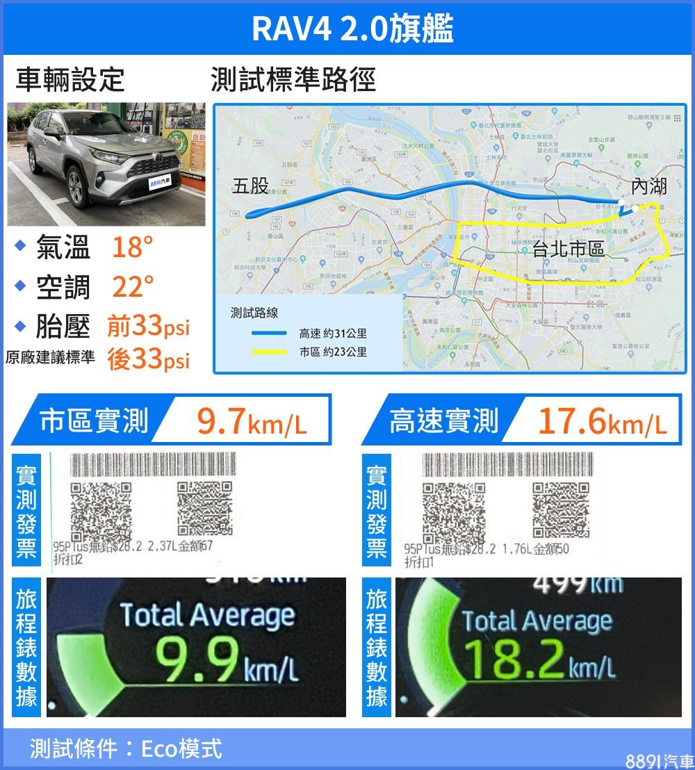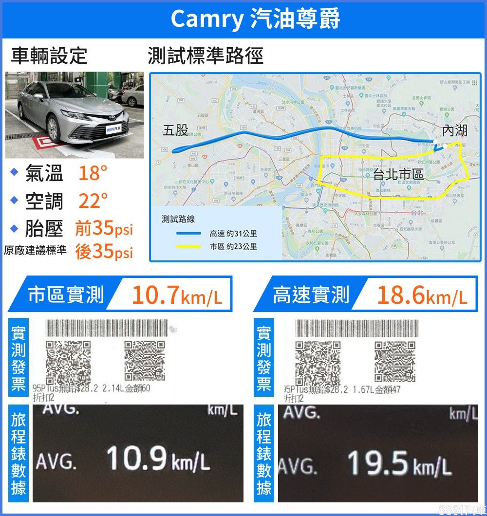 有著相同動力配置,兩車整體油耗表現相當,然而畢竟Camry車重少了100kg,數據上不論在高速或市區油耗皆較RAV4小幅勝出。測試當日高速路段車輛稍多但不至壅塞,車速大致能維持在固定區間,實測成績普遍出色,RAV4已有17.6km/L的水準,Camry的18.6km/L又更亮眼些。市區路況一陣走走停停下來,Camry與RAV4分別測得10.7km/L及9.7km/L的數據,差異同樣不算顯著。