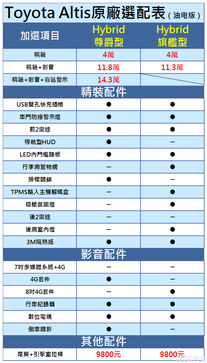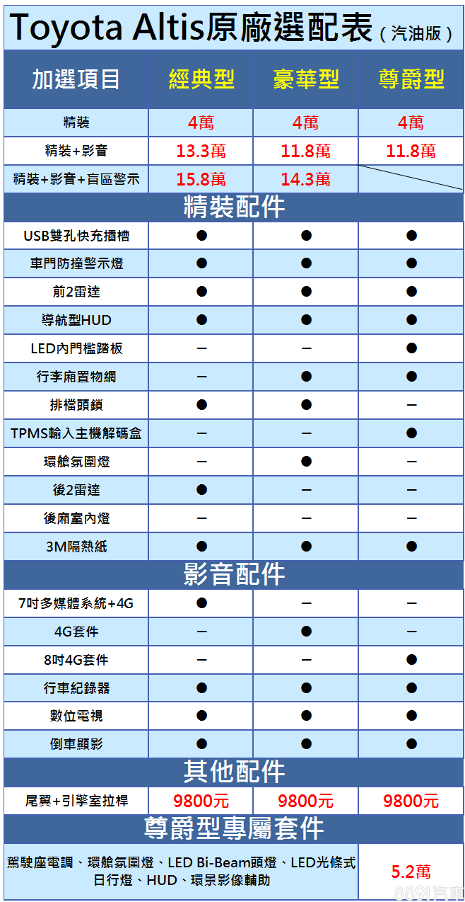 據國都經銷據點的資料,原廠目前為新Altis所提供額外加價的選配套餐,主要為「精裝配件」與「精裝+影音配件」兩種,另也有加選盲點偵測的部分,此外汽油頂規尊爵型,也可以加價選配油電頂規獨有的配備,特別一提的是,其中Hybrid旗艦型若把精裝和影音都選好選滿,帳面上價格將破百萬,當然多和業務「交陪」準沒錯,各經銷商業務約可提供5000~20000不等的折扣優惠,而通常汽油車款能較Hybrid車型換得更高的優惠額度!