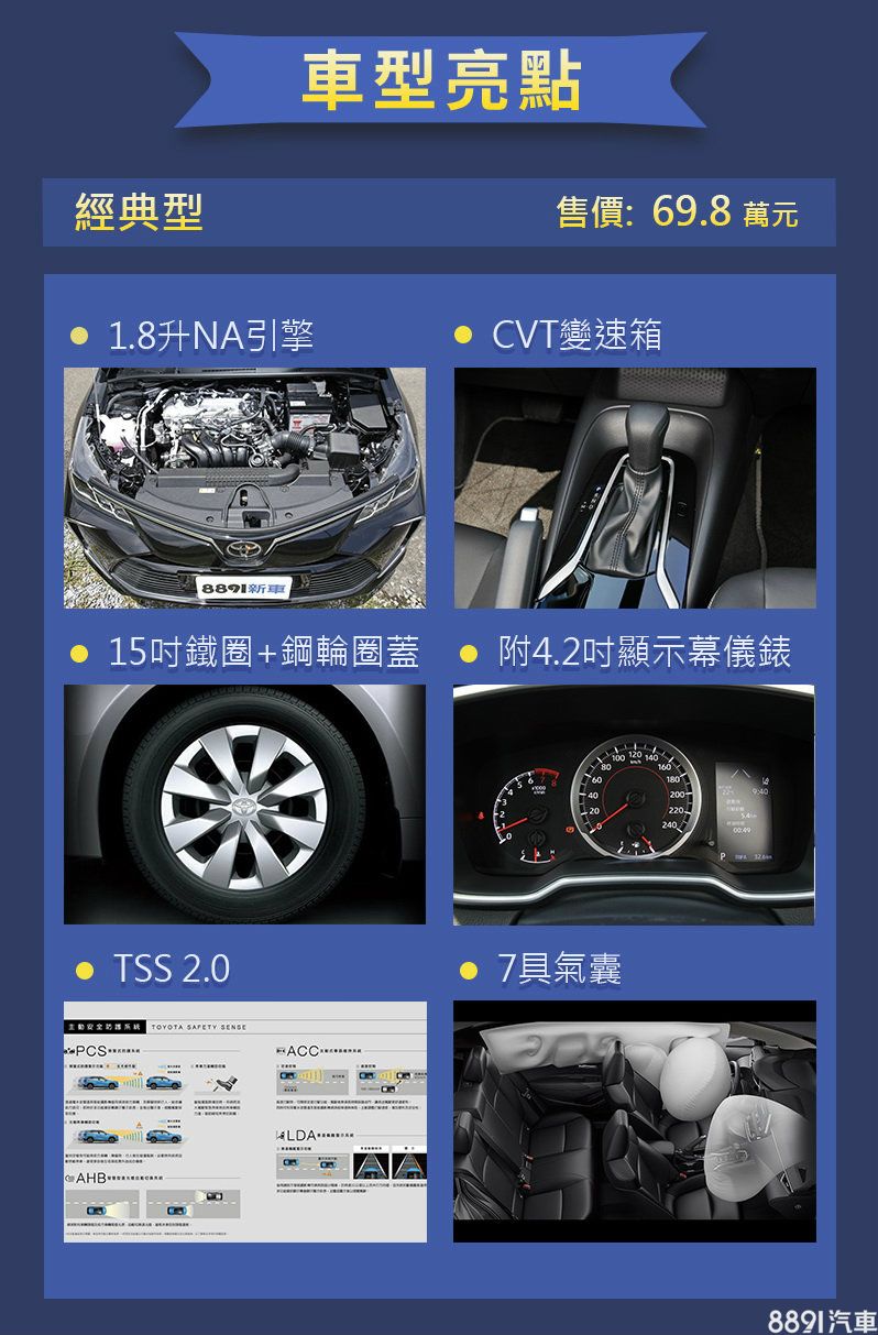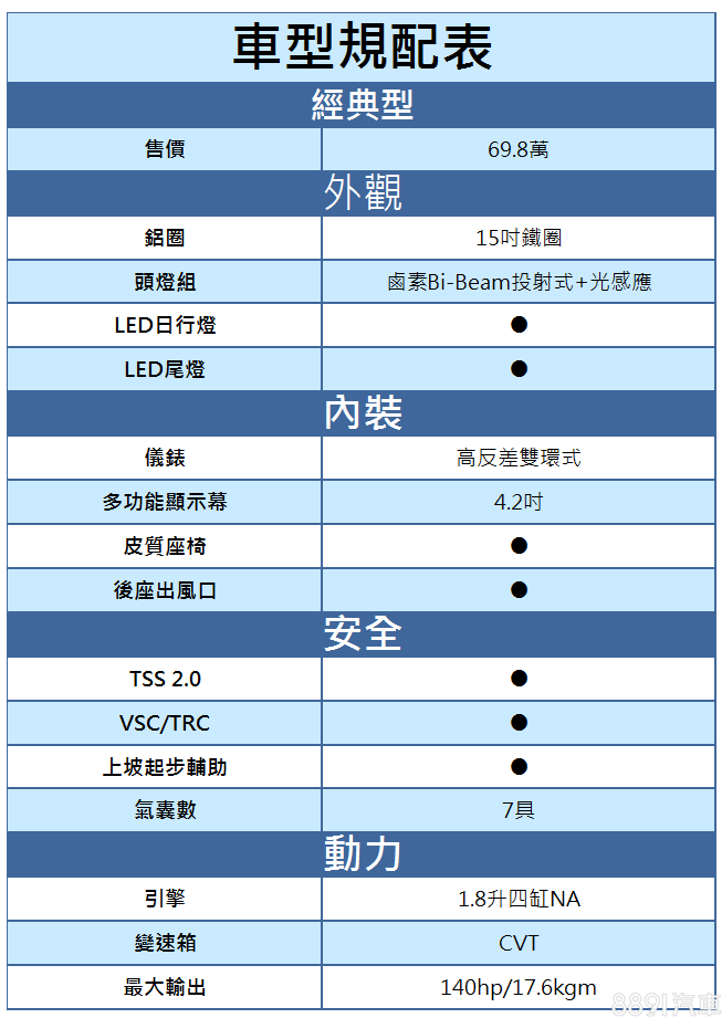 標準的入門款,經典型除了由於全車系標配TSS 2.0、7氣囊有感加分外,其餘配備依舊趨於陽春,若只是想找部好維修的國民代步車,也不失為一種選擇。