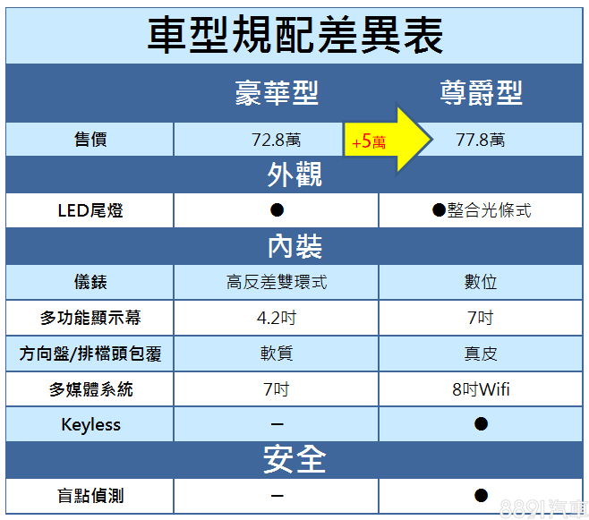 新一代Altis採5車型編成,各車型間價差5~8萬,不算多,本身價格帶在同級對手中也算是「合理範圍」,不過加上經銷商推出多種選配套餐,「神車」身價還是有機會「直上百萬」!買車雖比買房簡單,不過按照自身需求選擇「重中之重」才是王道。