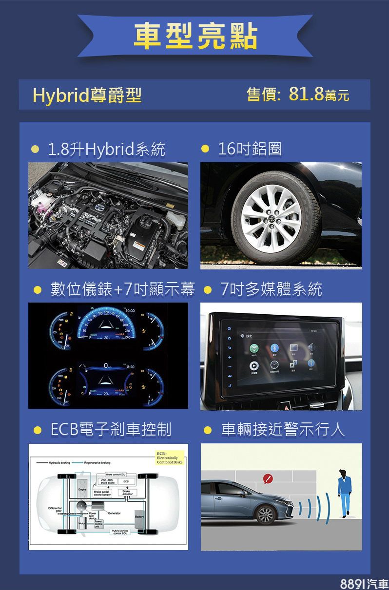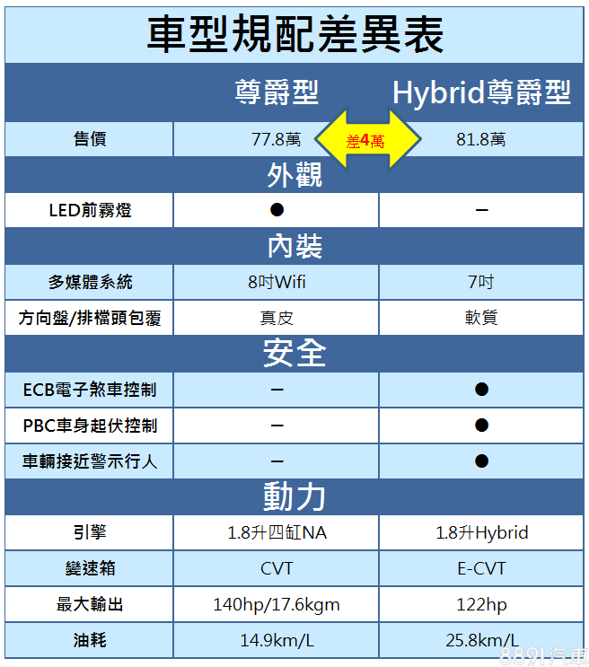 汽油頂規的尊爵與Hybrid入門的尊爵型僅4萬元價差,然而後者將部分非必要性配備(中央螢幕多1吋、真皮包覆方向盤與排檔桿)捨棄,取而代之的是油耗優勢,以及ECB電子剎車控制、PBC車身起伏控制等剎車輔助功能,看似吸引力增加,不過除非是頻繁用車者,不然除了大眾還是習慣汽油動力多些,1.8升汽油動力的「萬年屬性」,在穩定與保修優勢上,還是較讓人安心,有鑑於此,原廠為了推油電車型,也於先前將電池保固提升至8年/16萬公里。