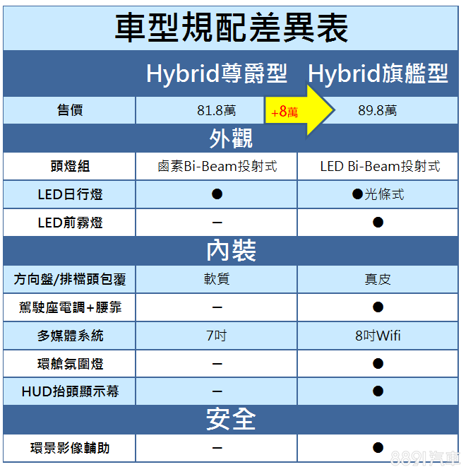 Hybrid旗艦型除了把Hybrid尊爵型沒有的非必要性配備補齊,增添內裝質感與科技感,更是全車系獨家標配LED頭燈、LED光條式日行燈、氛圍燈、HUD和環景的車型,簡單說,加的8萬讓旗艦「虛華度」達到該級距中高價格帶應有的水準,以上配備其實在汽油尊爵可以5.2萬的代價獲得,而其中差的2.8萬自然是油電系統,追求油耗、還是汽油動力的「安全感」(畢竟油電系統構造較傳統燃油引擎來得複雜,若「有個萬一」費用上大多會高出一截),確實應該評估自身需求再下定論。