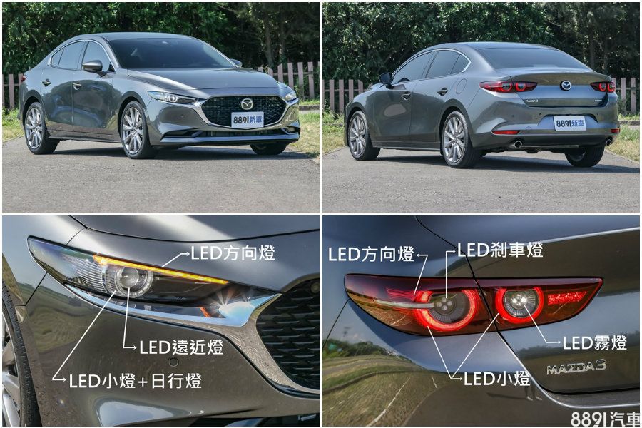 房車版Mazda3水箱罩飾條採用常見的鍍鉻色,不像五門版的亮黑塗裝而帶有一點殺氣,不過也因如此,車頭遠看還是有和舊款混淆的可能。由於試駕車型是售價逼近百萬的頂規版本,頭燈為全LED附智慧遠燈功能,尾燈部分也採全LED配置,並搭載18吋鋁圈,外觀的配備水準完整。