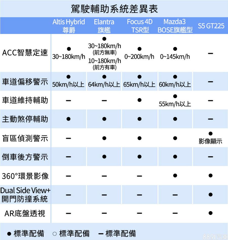 從差異表可得知,Focus的安全輔助科技完整度最高,再來則是Mazda3,還多了360度環景影像,就差在車道維持輔助因車速限制僅能應用在郊區環境,而Altis Hybrid和Elantra的ACC功能類似,都無法隨前車至靜止,使用上的便利性就打了折扣,至於S5 GT225雖然缺少對手幾乎都有的主動駕駛輔助,但卻有獨門的全車AR行車影像系統,還有開門防撞系統,也算是強化了安全防護標準。