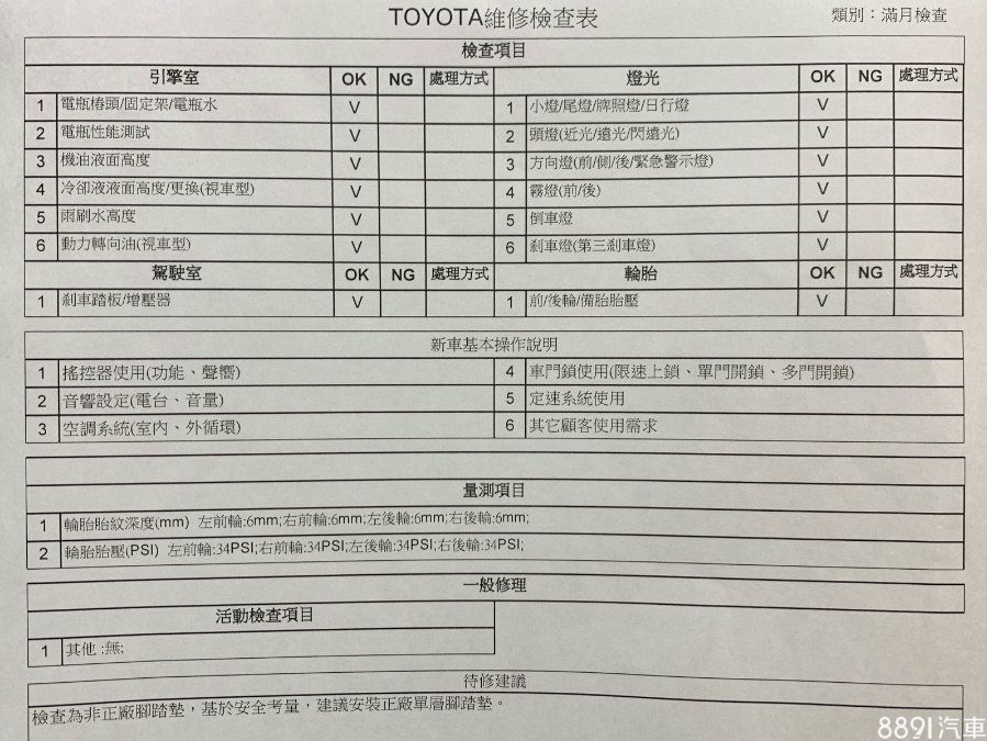 這是本次滿月檢查的維修檢查表,主要是免費檢查電瓶、機油、輪胎及車燈等基本項目。
