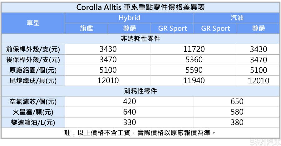 雖然GR Sport因有運動化套件而讓上述非消耗性零件保養成本增加,但其他消耗性零件如濾芯、火星塞等皆與對應的Altis汽油/Hybrid車型相同。只要行車上多注意,避免非消耗性零件的額外支出,其實花費與車系其他車型差不多。