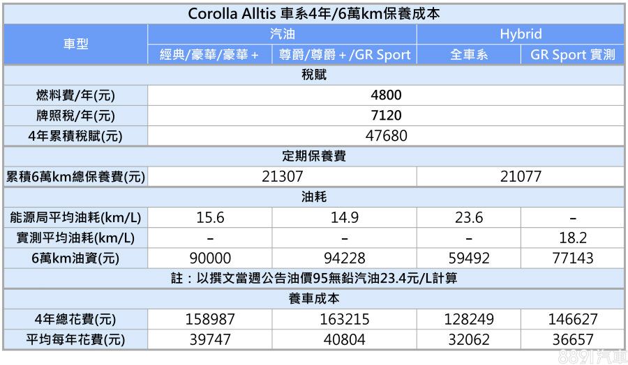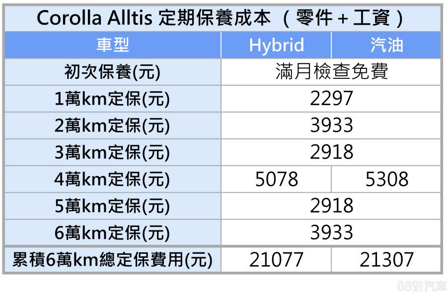 不論GR Sport或一般車型,油電Altis全系列定保成本相同,累積6萬公里的定期保養成本也與汽油車型相當。