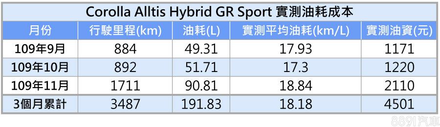 Altis Hybrid GR Sport累計3個月實測平均油耗是18.2 km/L,遠低於能源局公布Altis油電車23.6 km/L的表現,因此油資若以能源局數值計算會少估很多。雖說如此,但油電Altis實測平均油耗仍勝過汽油車型14.9~15.6 km/L的能源局數據!