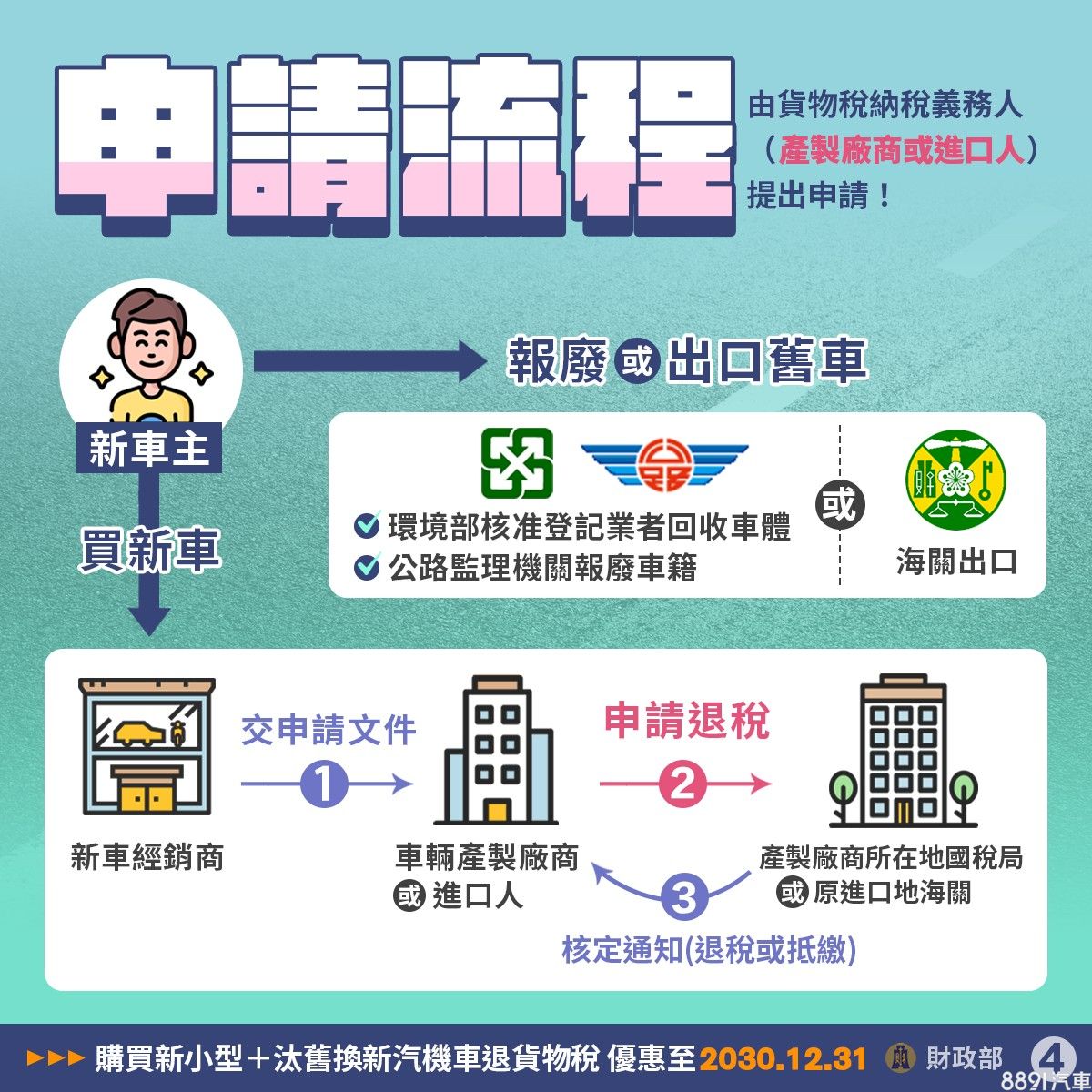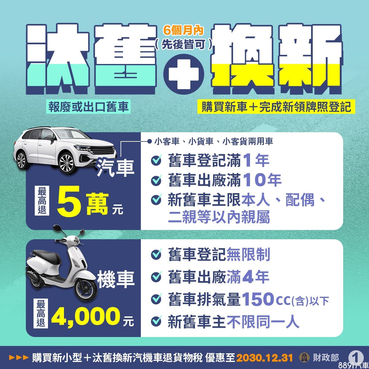汽機車汰舊換新減徵貨物稅是既有政策延續,原定2026/1/7屆滿,貨物稅條例修正後,實施期限延長至2030/12/31止。以汽車為例,汰舊換新最高退稅5萬,舊車報廢或出口與購買新車需在6個月內、先後順序不限,但舊車需符合登記滿1年、出廠滿10年之小客車、小貨車、小客貨兩用車,且新舊車主限本人、配偶、二親等內親屬才能申請。
