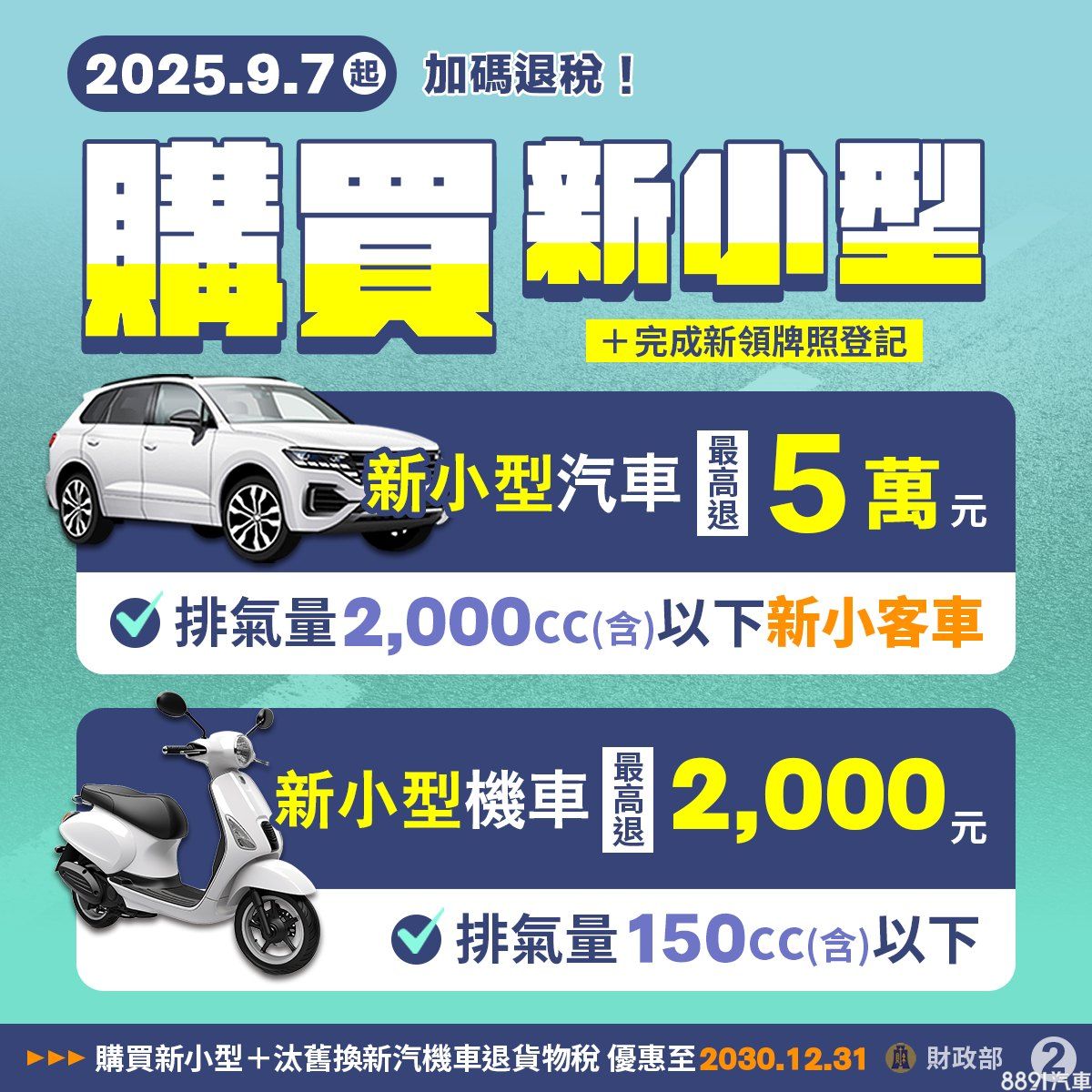 上述提到「汰舊換新」與「新購小型車」是雙重優惠、退稅額度可以疊加!也就是說購買2000cc以下小客車、同時符合汰舊換新資格,最高可減稅10萬;購買150cc以下機車、同時符合汰舊換新資格,最高減徵6000元貨物稅。