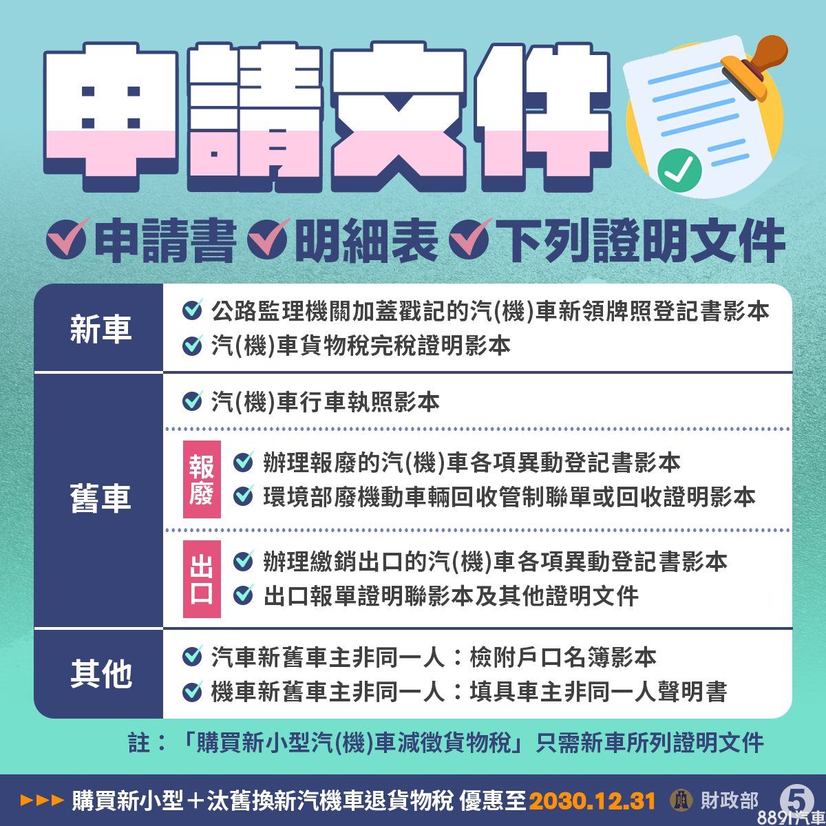 申請「汰舊換新」,車主需繳交汽/機車行照影本,舊車若是報廢需附上辦理報廢汽/機車各項異動登記書影本、環境部廢機動車輛回收管制聯單或回收證明影本,若是辦理出口,則需附上繳銷出口的汽車/機車各項異動登記書影本、出口報單證明影本;當然,如果是單純「新購小型車」就簡單多了,只要繳交汽/機車領牌登記書影本及貨物稅完稅證明影本即可。