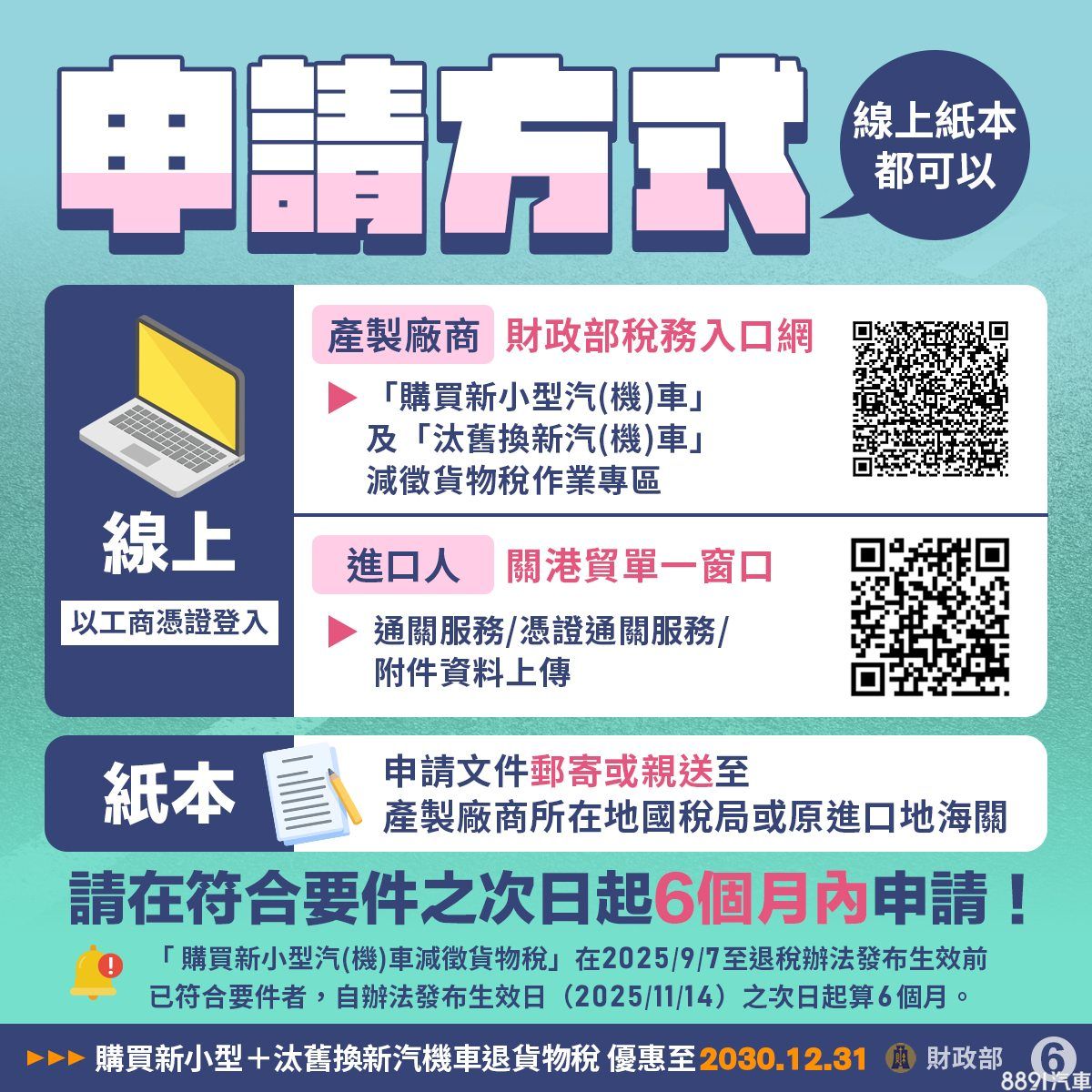 申請方式管道多元,可以線上附件資料上傳、或將申請文件郵寄或親送至相對應的主管機關,並在符合要件之次日起6個月內申請才能退稅。值得一提的是,「新購小型車減徵貨物稅」是修正新法,雖於2025/9/7生效,但申請辦法直到2025/11/14才發布,有車主擔心若在此期間購車並完成領牌,申請期限是否會被壓縮?不過財政部解釋,上述「過渡期」的車主不受限制,而是自辦法發布生效日起6個月內均可申請退還新車貨物稅,不影響退稅權益。