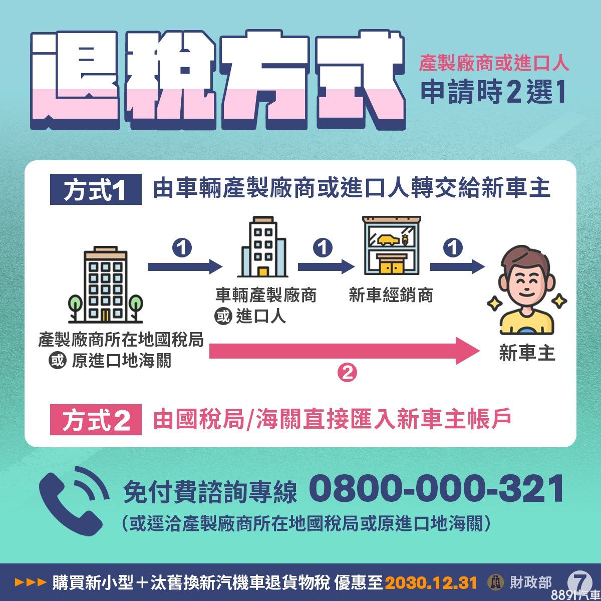 申請退稅款項有2種撥付管道,可以選擇由車商/進口人轉交給新車主,或是由國稅局/海關直接匯入新車主指定帳戶。