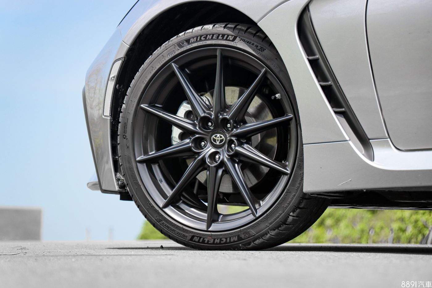 輪圈使用18吋規格,10幅式霧黑設計簡單俐落,搭配215/40R18的米其林PS4,運動性與舒適度都兼顧,符合GR86定位。