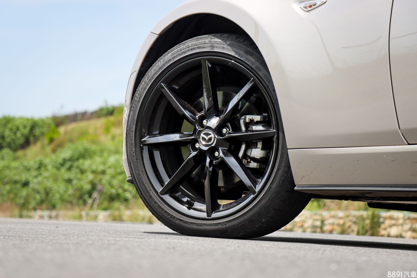 MX-5使用黑色17吋鋁圈,與GR86同樣都是多幅式設計,不過造型更簡單些,配胎是205/45R17的普利司通Potenza S001,與GR86的PS4算是同等級的運動街胎,對應MX-5的馬力與輕盈車重綽綽有餘,不過試駕車的胎況已屆汰換邊緣,這會對後續的性能測試有影響。
