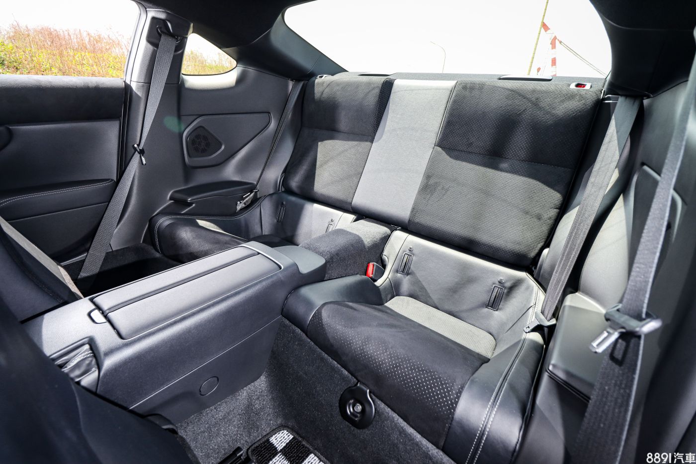 GR86規劃是2+2座,所以後座空間很小並不意外,會買這車也不會把空間看太重,除了偶爾應急載載人,主要還是用來放包包,而後座也同樣能見到大量人造麂皮,與前座互相呼應。