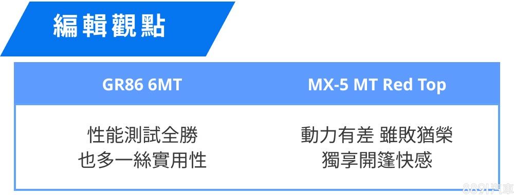 實測結果不出所料,GR86靠著更大動力讓加速成績更好,更寬的配胎與更運動化的懸吊,也幫助在賽道拿下更好的成績,最終在性能測試一舉全部勝出,底盤精良、均衡好開,再加上2+2座配置,比起MX-5有更彈性的空間運用,作為一輛日常用車也沒有不行!若真的要說,這次唯一可惜的就是加速成績7.03秒與官方的6.3秒有些落差,也許是場地、天氣甚至是車況因素影響,有機會還真的想再上訴一回!