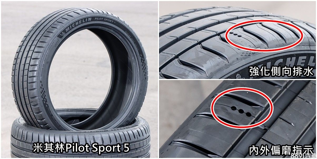 現在性能街胎,除了強調乾地性能表現,對於濕地表現也是相當注重,畢竟除了性能,濕地操控也屬於安全性一環,而米其林Pilot Sport 5在官方網站中,更是直接表明「濕地單圈」成績更勝對手,同時強調長效性能,官方表示在輪胎磨耗大半之後,性能表現耗損是較少的。還有一個小細節,就是在胎面內側、外側都可以找到3個小點,作為內外偏磨指示用。