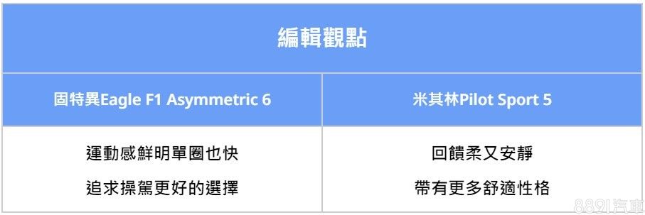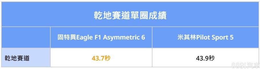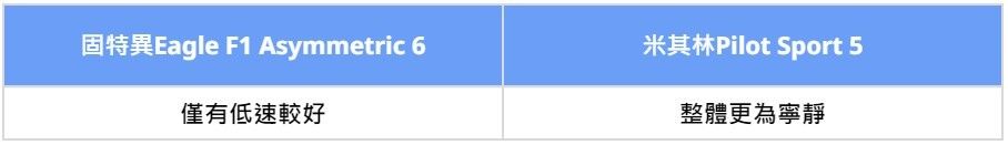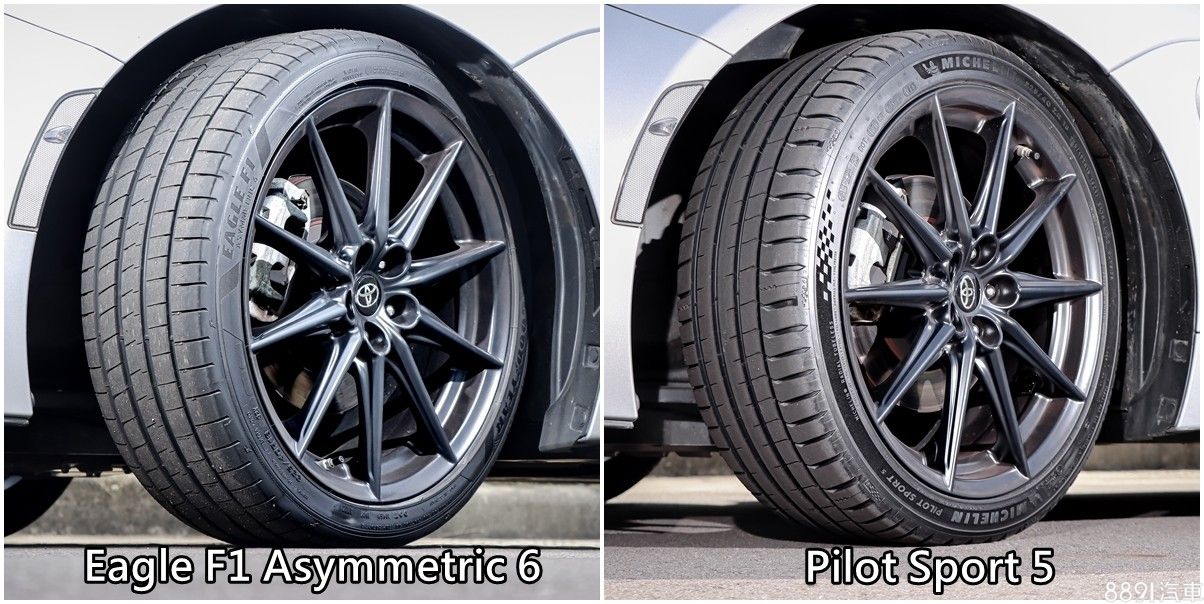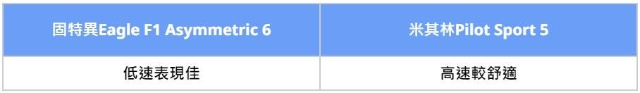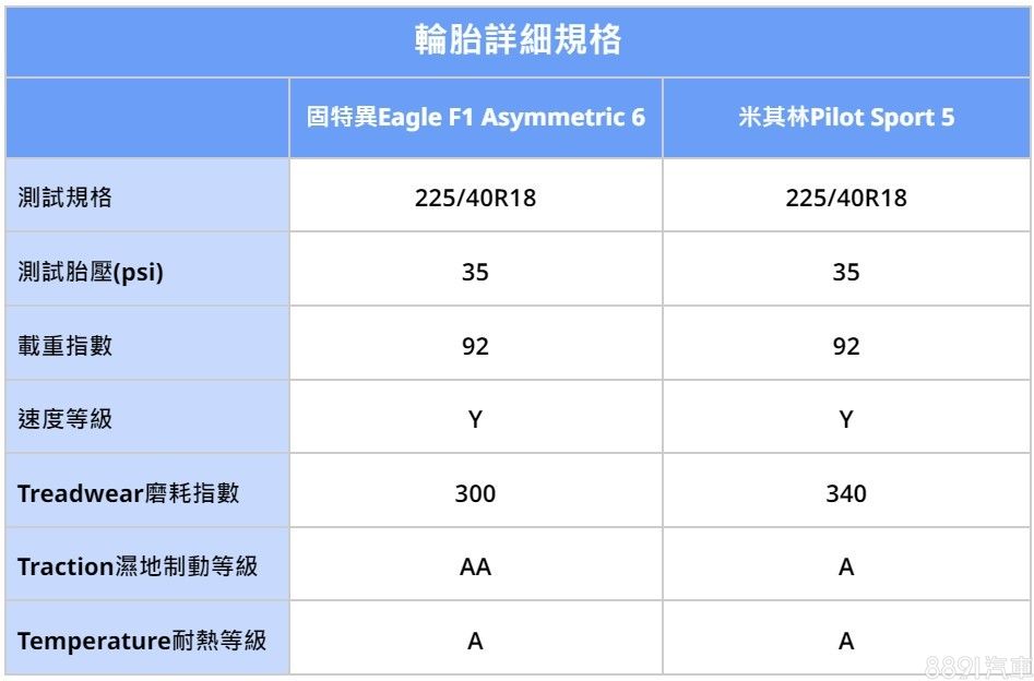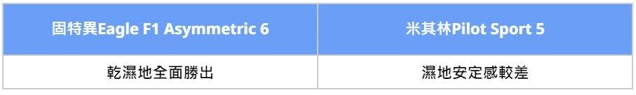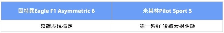 我們把兩套胎規格羅列出來比較,可以發現最關鍵差異,在於Treadwear磨耗指數、Traction濕地制動等級不同。固特異Eagle F1 Asymmetric 6磨耗指數低、濕地制動等級高,以數據來看,乾、濕抓地性能都應該要更出色一些,實際表現還是要賽道跑過才知道。