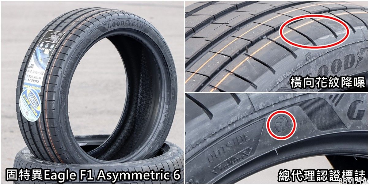固特異Eagle F1 Asymmetric 6原廠簡稱「F1A6」,這款性能街胎已經在市面上販售許久,但原本都是水貨,直到今年5月總代理才正式引進,為了識別公司貨,外側胎壁會有一個方向盤圖示,並提供保固服務。相較於舊款F1A5,F1A6主打乾濕地性能全面提升,因應電動車款需求,也特別強調低胎噪,以及滾動阻力低,換取更好的行路質感與電耗表現,而在既有印象中,低胎噪、低滾阻,向來都不是性能胎款重點,設計看似很全面,但能否顧好性能本色是測試重點,也是我們好奇的地方。