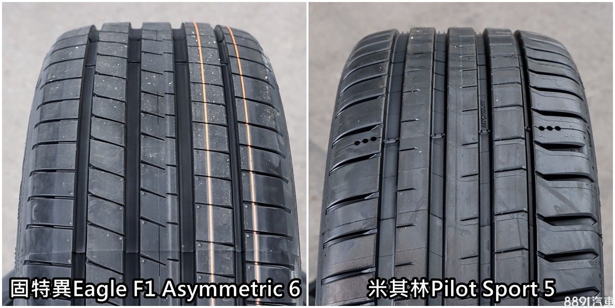 兩套胎都強調濕地性能,在胎紋設計上,也能看出相似設計理念,四條直向排水主溝,in side三條採用較粗主溝強化排水,out side主溝細則是為了增加側向抓地面積,以符合乾、濕抓兼顧的產品特性。差異較明顯的是橫向花紋,米其林Pilot Sport 5內外側橫向花紋較粗,強調側向排水,固特異Eagle F1 Asymmetric 6則是側向花紋細,強調靜肅性。