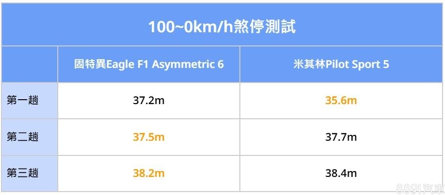我們這次也進行了100~0km/h煞停測試,一共進行三趟,結果相當有趣,在第一趟PS5測出35.6m,明顯比對手初次煞停成績優異許多,但爾後的第二、第三趟,反倒是F1A6更出色一些,這也與賽道時的表現吻合,PS5初次煞停最好,但容易因胎面溫度,而造成性能衰退,F1A6則是有較佳的穩定性。