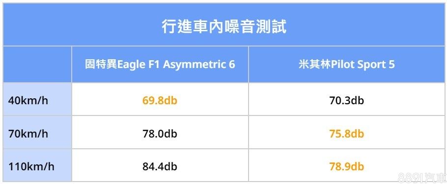 F1A6胎紋有強調靜肅性,但事實上較強韌的胎壁支撐性,所帶來的路感回饋更強,伴隨的就是更多一些胎噪聲,從數據表現可以看到,僅有40km/h時比PS5略好一些,來到高速路段,都是PS5明顯勝出,如果你想裝性能胎,又很在意胎噪表現的話,PS5就是不錯的選擇。
