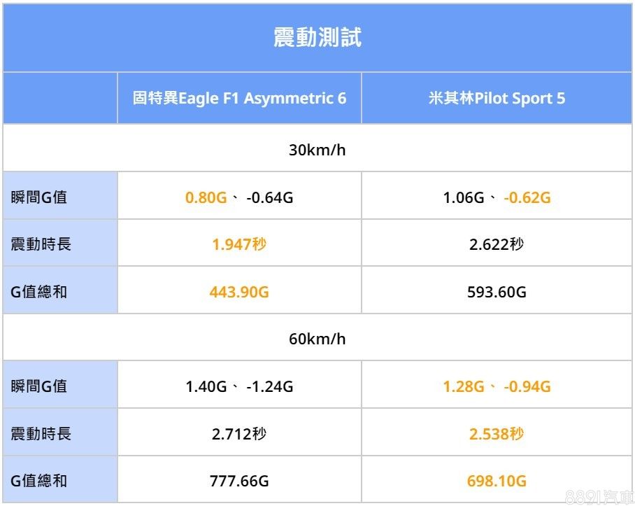 底盤震動一直是超級測試的固定內容,這次拿來測試輪胎,在同一台車輛安裝、胎壓相同下,數據結果其實也有不小差距。以低速30km/h通過陣仗,F1A6擁有比較好的制震表現,雖然瞬間衝擊感與對手差不多,但震動時長短、回穩快速,G力總和也更低;但隨著速度提升用60km/h測試,瞬間衝擊感明顯就比PS5更強,縱使震動時長差異不大,在最後G力總和還是更高,結果來說,一個低速好、一個高速佳,兩者平分秋色。