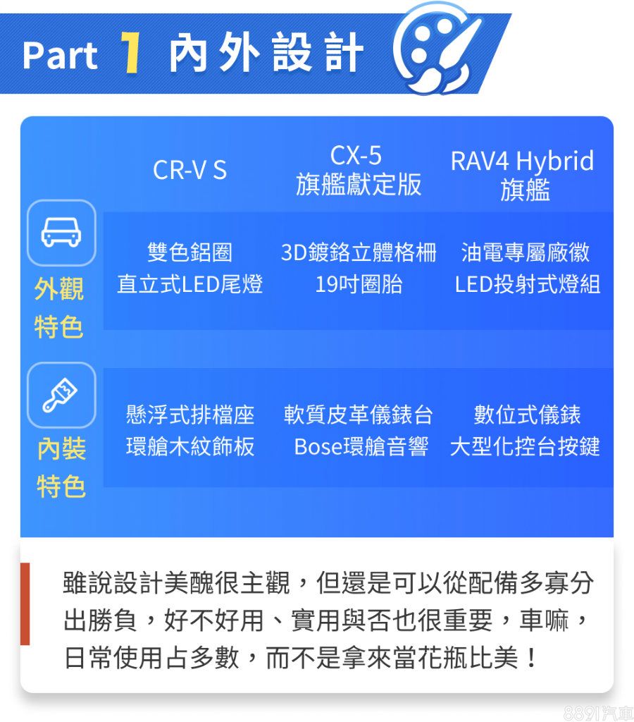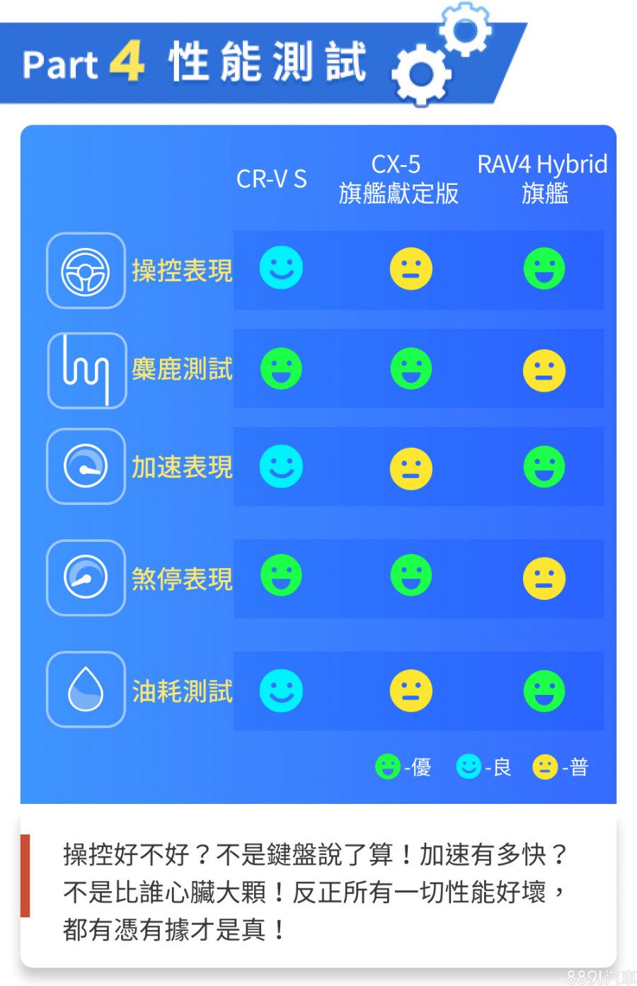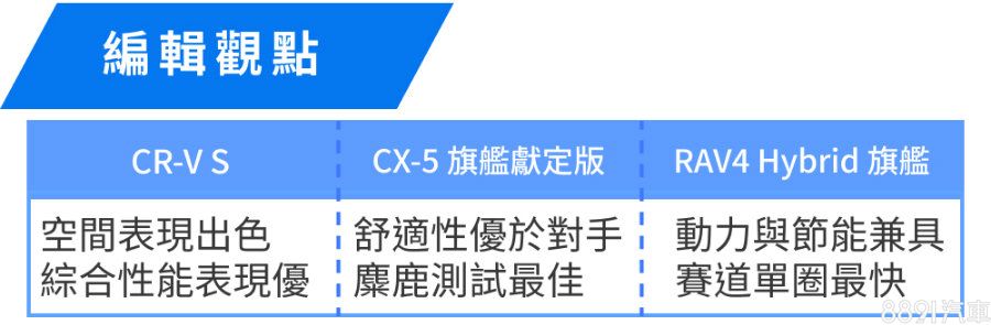 規格表攤開一看,三車價格帶相當,而光憑數據而言,油電加持、輸出最高的RAV4 Hybrid最佔上風,兼具性能及節能的特性會是一大優勢;仰賴渦輪壓榨動力的CR-V,過去實測表現都在同級前段班,實力不容小覷;甫於近日推出新車型的CX-5 2.0,帳面數據不敵對手,預料性能項目將會吃足苦頭,然而超級測試不只比動態,涵蓋靜態測試在內的整體表現才是重點,不看到最後勝負難以定奪!