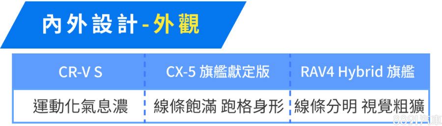 Honda CR-V共分VTi-S及S兩種車型,是三者中唯一缺少四驅車型可選,偏向「都會休旅」定位,並透過尾門擾流翼、雙出排氣尾管等,盡可能添加運動化氣息。S版外觀多了鍍鉻飾條、全景天窗,外觀差異並不大。全車系標配LED光感應頭燈,附遠光燈自動切換,但缺少主動轉向輔助,直立式LED尾燈辨識度頗高。