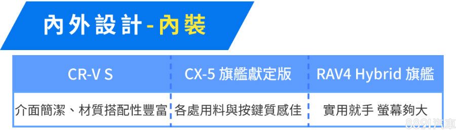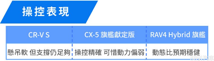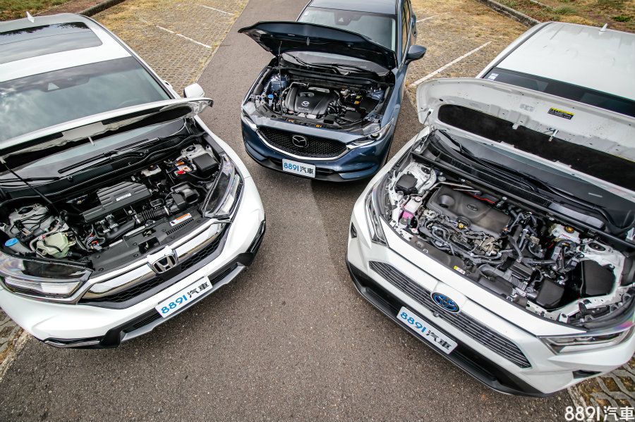 三車引擎型式各自有別,輸出最小的CX-5採2.0升自然進氣引擎,最大動力165hp/21.7kgm,搭配附Sport模式的六速手自排變速箱。CR-V以1.5升四缸渦輪引擎壓榨出193hp/24.8kgm,變速箱則為附S檔及模擬7速檔位的CVT本體。馬力最大的RAV4 Hybrid採油電架構,以2.5升自然進氣引擎搭配電動馬達輔助,創造218hp綜效輸出,且具備Eco、Normal、Sport及EV Mode四種模式切換。