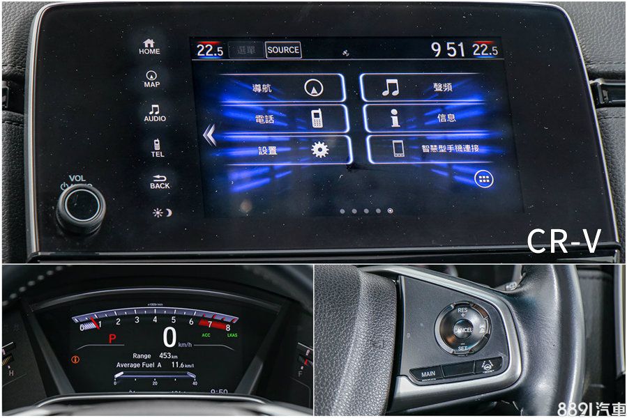 7吋觸控螢幕尺寸雖是三者最小,但內建導航、也支援Apple Carplay、Android Auto連結,機能還算完善。方向盤整合ACC、車道維持按鍵,後方更配有換檔撥片,配合CVT模擬七速功能可自主決定檔位。液晶儀錶畫面清晰且色彩配置簡潔,視覺感特別,但可惜無中文顯示。