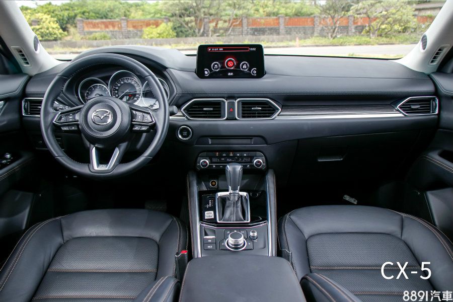 CX-5內裝線條簡潔,大量橫向線條的設計,也讓視覺感看起來更開闊,中控台上部採軟質塑料鋪底,搭配皮革包覆、金屬木紋飾板等點綴,按鍵等操作介面的使用回饋紮實,無論是視覺或觸覺質感都屬三者之最。