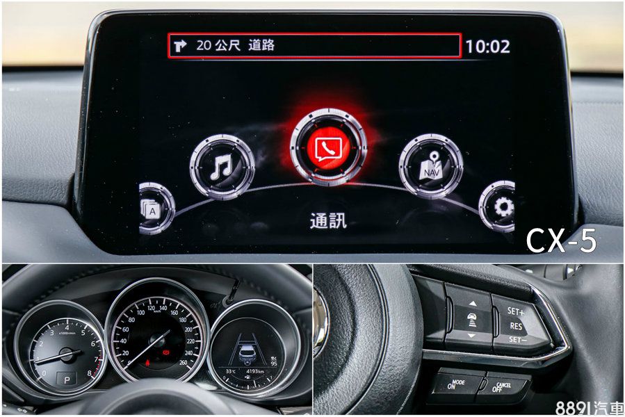 CX-5要到最頂規的2.5 AWD車型才配備7吋數位儀錶,試駕版本則採傳統三環式設計,搭配全彩抬頭顯示器,方向盤整合ACC、車道維持按鍵,同樣配有換檔撥片。8吋觸控螢幕,除了內建衛星導航外,還支援Apple CarPlay/Android Auto連接,並附有10支揚聲器的Bose音響,視聽娛樂的豐富度CX-5略勝一籌。
