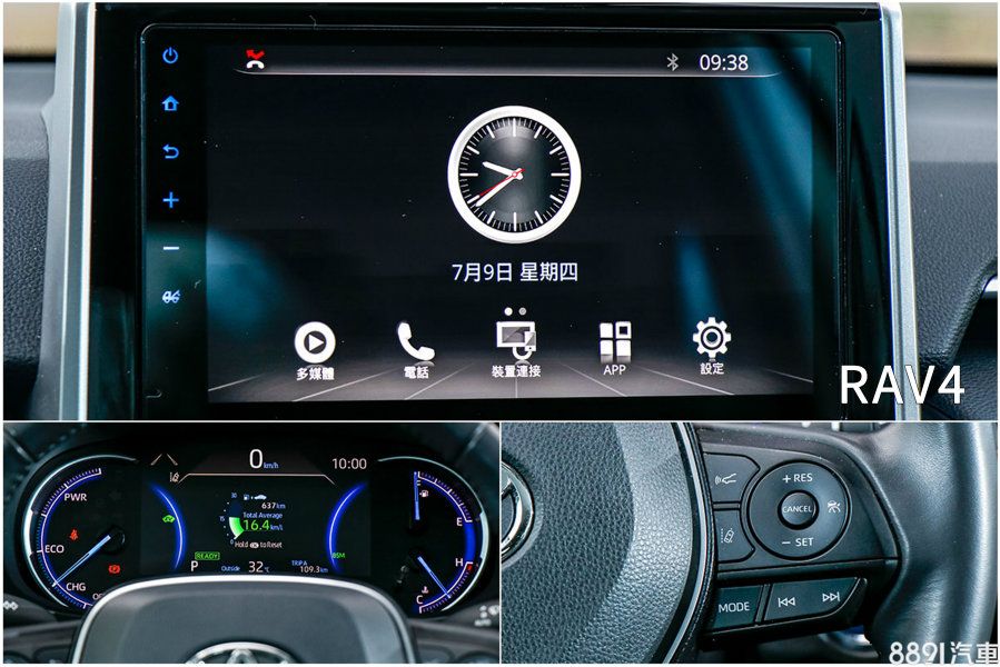 配置9吋WiFi聯網觸控主機,連上手機熱點後可提供即時路況等基本資訊,但整體功能並不算豐富,也不支援Apple Carplay等智慧型手機介面,但螢幕夠大夠清晰,方便閱讀。方向盤按鍵整合ACC、車道維持等功能,使用邏輯相當好上手。7吋液晶儀錶結合兩旁傳統指針,能輕易判斷當前油電系統輸出、回充狀況,液晶顯示更提供傳統指針與數位時速兩種顯示模式。