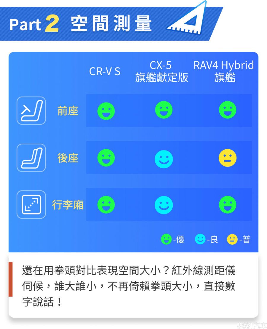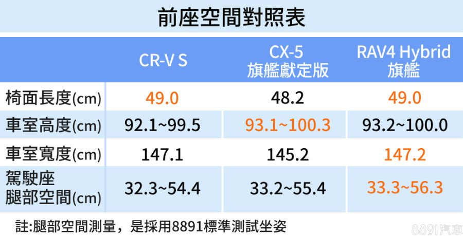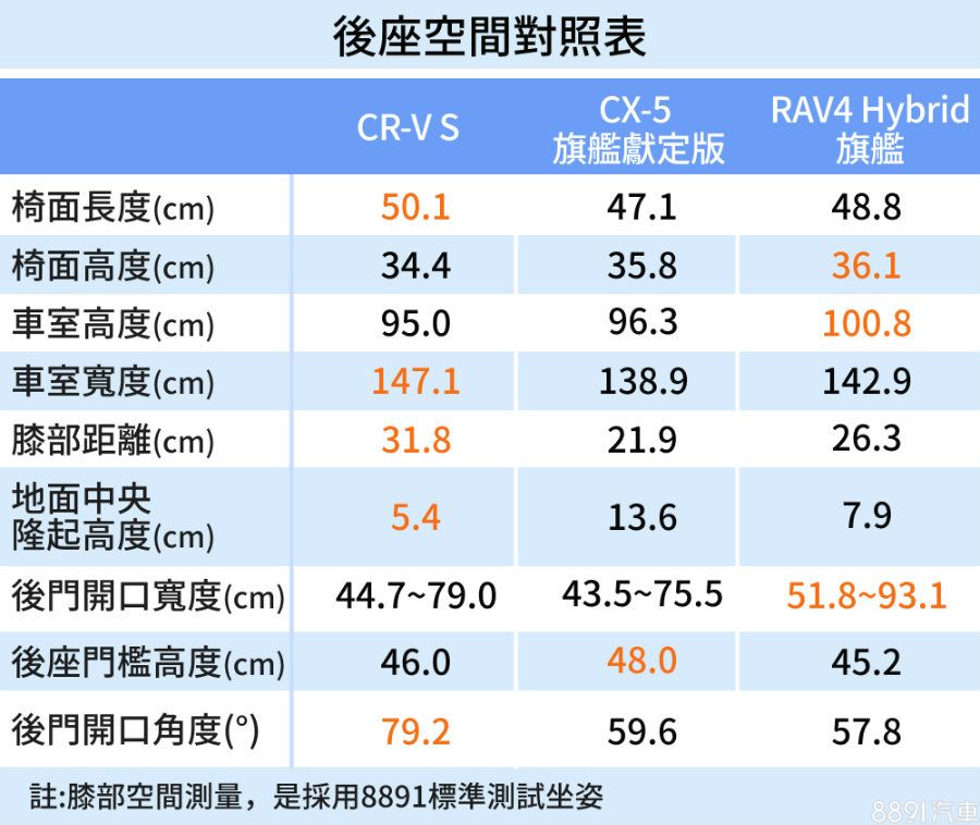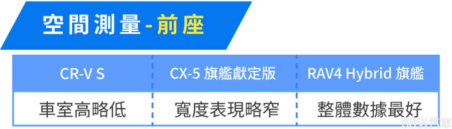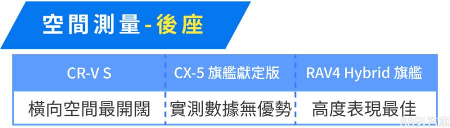 CR-V與RAV4兩者前座數據表現相當接近,尤其是在最有感的高、寬兩項數據,差異微乎其微,加上乘坐點高、中控台造型平直,在體感上也都相當開闊;至於CX-5運動風格鮮明,中控台與排檔座包圍感強烈,縱使在介面安排、駕馭感受上優異,但「空間感」相對壓迫,橫向寬度數據也稍差,就看休旅駕駛喜歡「雙田」的開闊感,還是Mazda主打的跑格設計!
