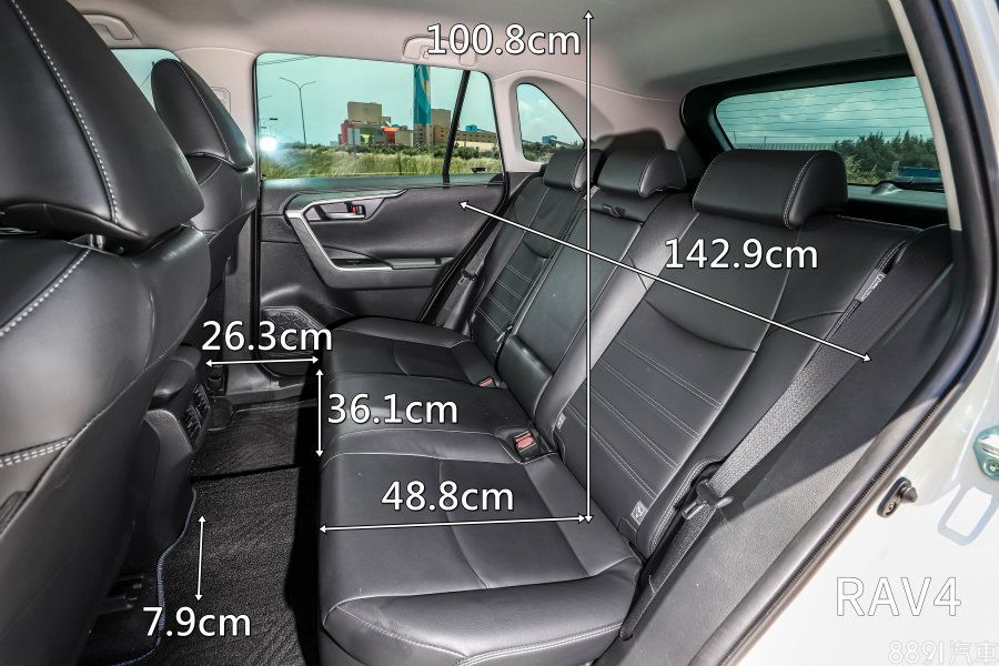 RAV4軟調的乘坐感,搭配服貼的椅面幾何,後排整體舒適度優於CR-V,但支撐性仍以CX-5較為紮實;受惠於較為方正的車格,RAV4頭部空間出色,膝部空間雖不若CR-V充裕,但表現尚可接受,唯設計較低的門板扶手折角不時抵著膝部位置,長途久坐下來略感惱人。