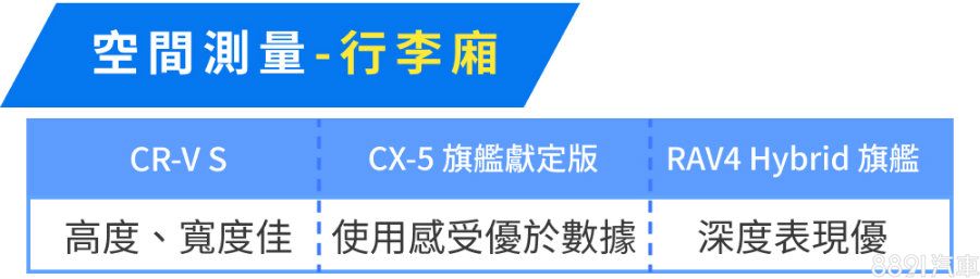 行李廂空間數據CR-V表現強勢,高、寬、深三大指標都優於對手,且空間規劃方正,平整化底板也能向下延伸,機能性也出色,但客貨橫桿在裝載大型物品時,還是會稍稍影響擺放。而CX-5雖然在高度部分吃虧,但寬度、深度都很夠用,廂內兩側平整化設計優、用料較好也是特點。