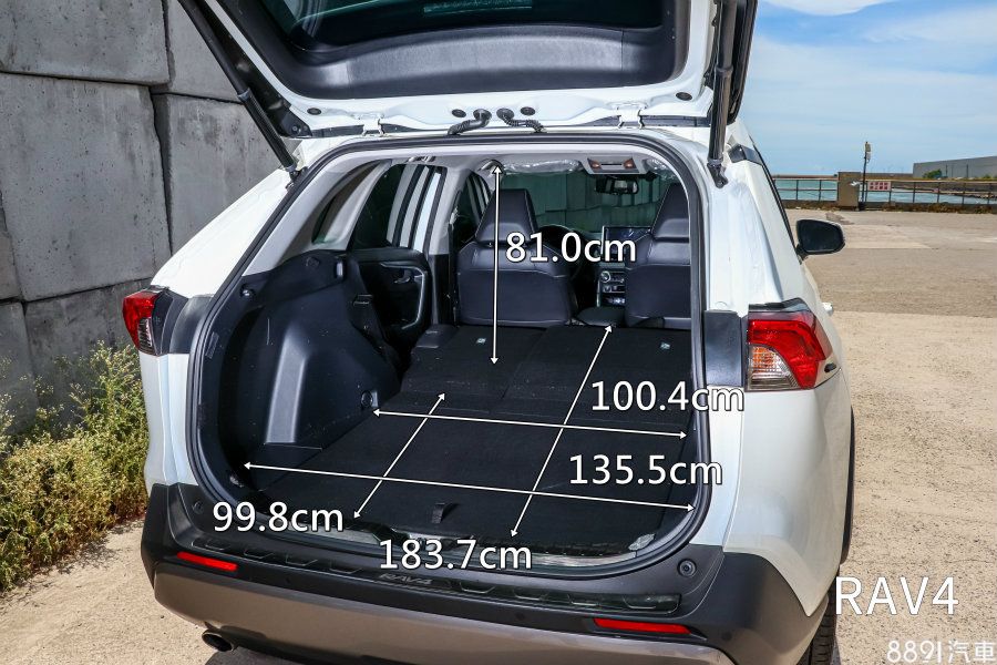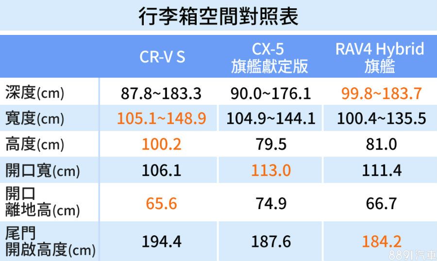 在後座未傾倒狀態下,RAV4擁有99.8cm空間深度,為全場最優,從圖片上看起來也最有餘裕,至於CR-V放行李廂後深度所剩無幾,但利用高度、寬度優勢也相當好放。CX-5數據表現最差,但實際用起來也沒到不堪,除高度明顯遜於對手外,寬度、深度都足夠,加上廂內兩側都有植絨包覆,能減少行李滾動敲擊的噪音,在質感表現上優於對手!